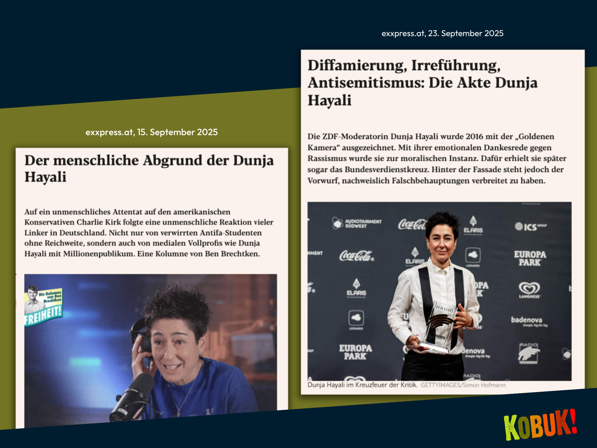An der Hasswelle, die daraufin über sie hereinbrach, war auch Julian Reichelt von Nius maßgeblich beteiligt: „Der menschliche Abgrund der Dunja Hayali“ lautete der Titel einer Kolumne, die auch der Exxpress veröffentlicht hat. Am 23. September legte Nius/Exxpress nach und warf Hayali Antisemitismus vor. Der Grund: Hayali sprach in einem Interview Bilder und Berichte aus Gaza an, laut denen das israelische Militär auf Zivilist:innen schießt.