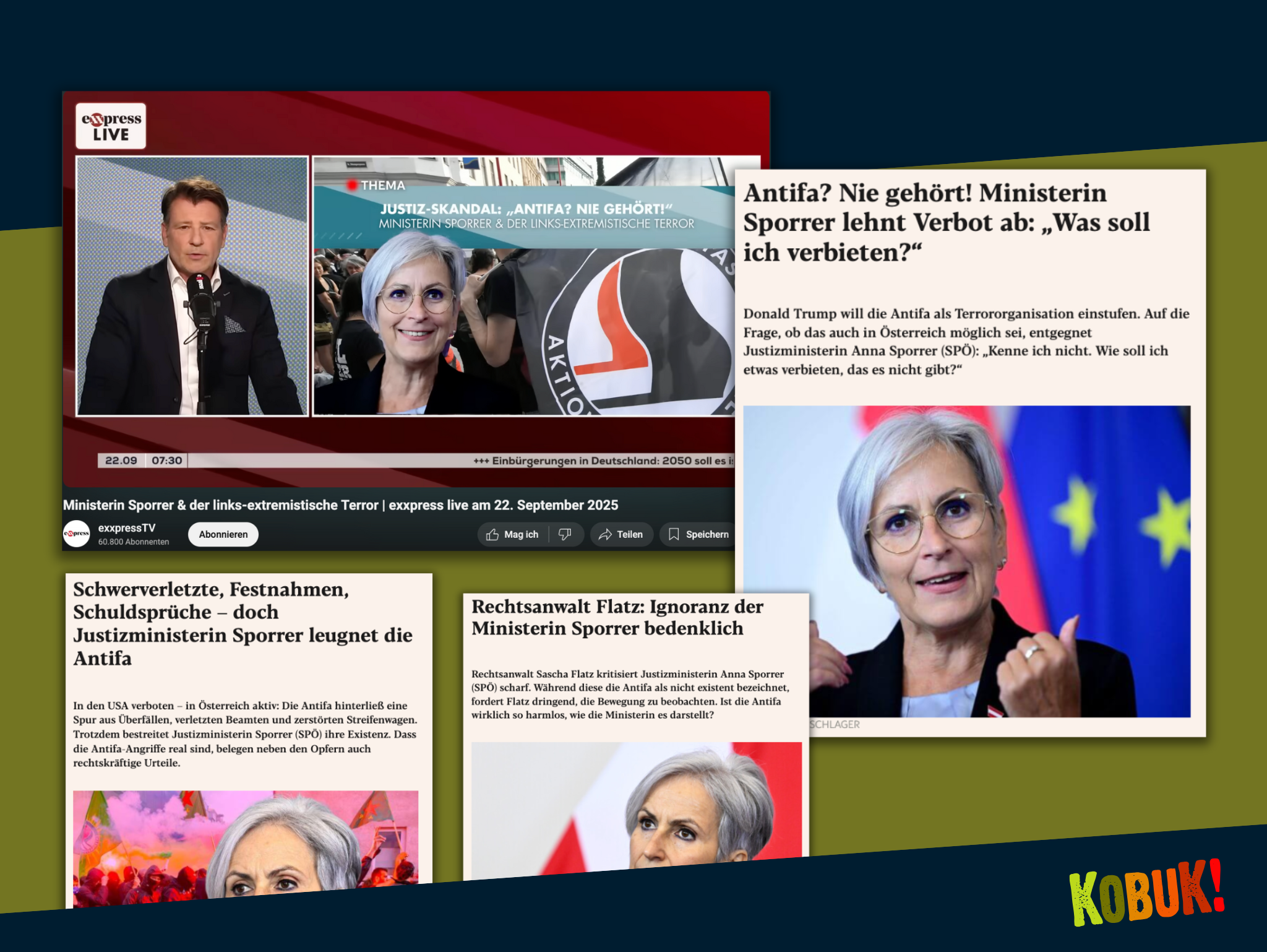 Für den Exxpress reicht die Antwort dennoch für einen „Justiz-Skandal“. In einem Artikel behauptet die Seite, Sporrer kenne „die Antifa“ gar nicht. Vier Tage später ist die von „einer Journalistin“ (sic) gestellten Frage immer noch das Thema des Tages in Exxpress TV. Der Titel der Sendung: „Ministerin Sporrer & der links-extremistische Terror“.