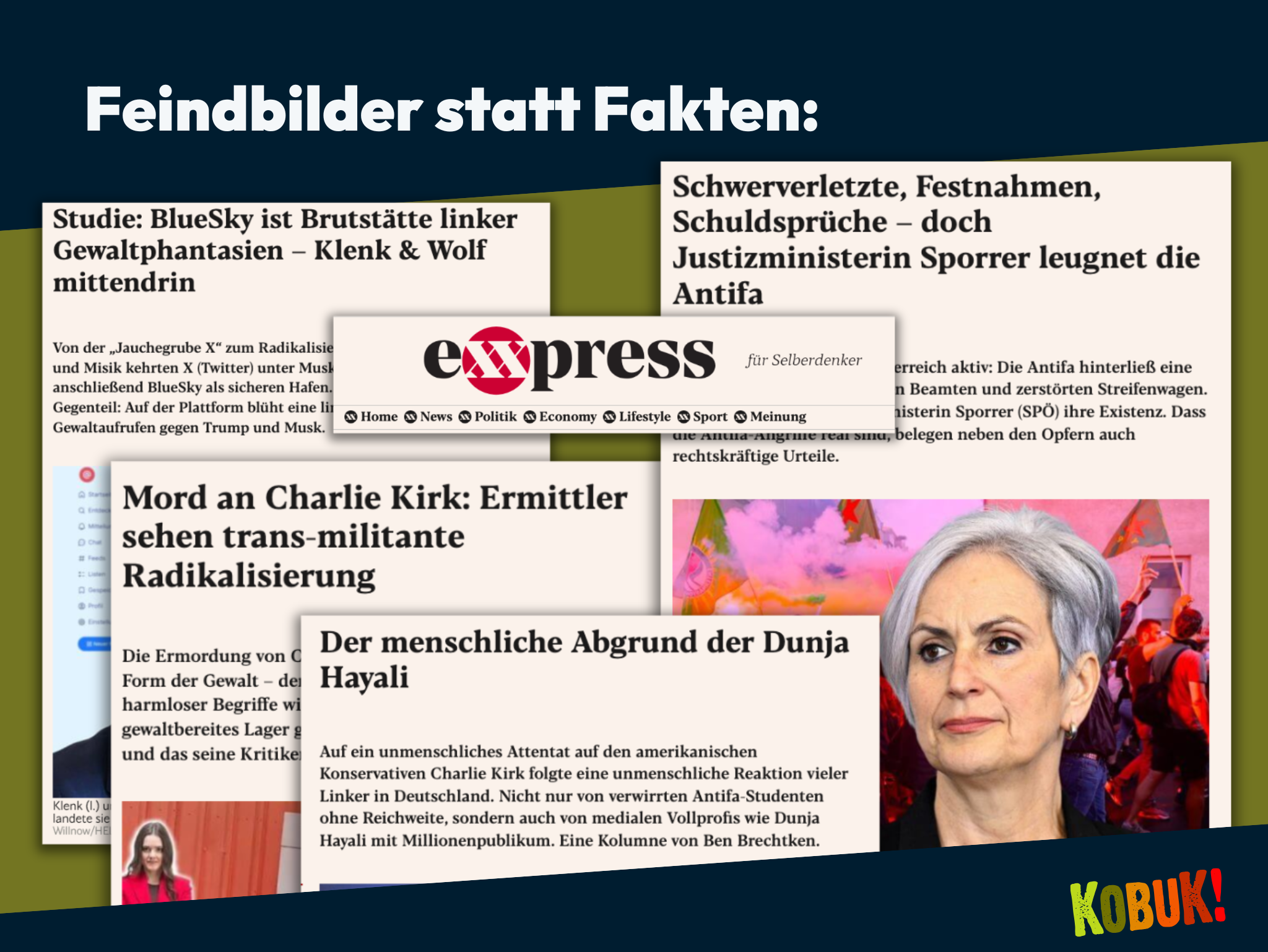 Der „Trans-Terror“ ist der neue Islamismus, die österreichische Justizministerin kennt die „Antifa“ nicht und Bluesky ist eine Brutstätte für Gewaltfantasien: Jenseitige Behauptungen und Falschmeldungen sind wir vom Exxpress gewohnt, aber seit der Ermordung von Charlie Kirk hat sich auch dort etwas verschoben. Die Seite arbeitet sich an Feindbildern ab und lässt vor allem die eigene politische Agenda Geschichten erzählen – auch wenn die mit der Wahrheit wenig zu tun haben.