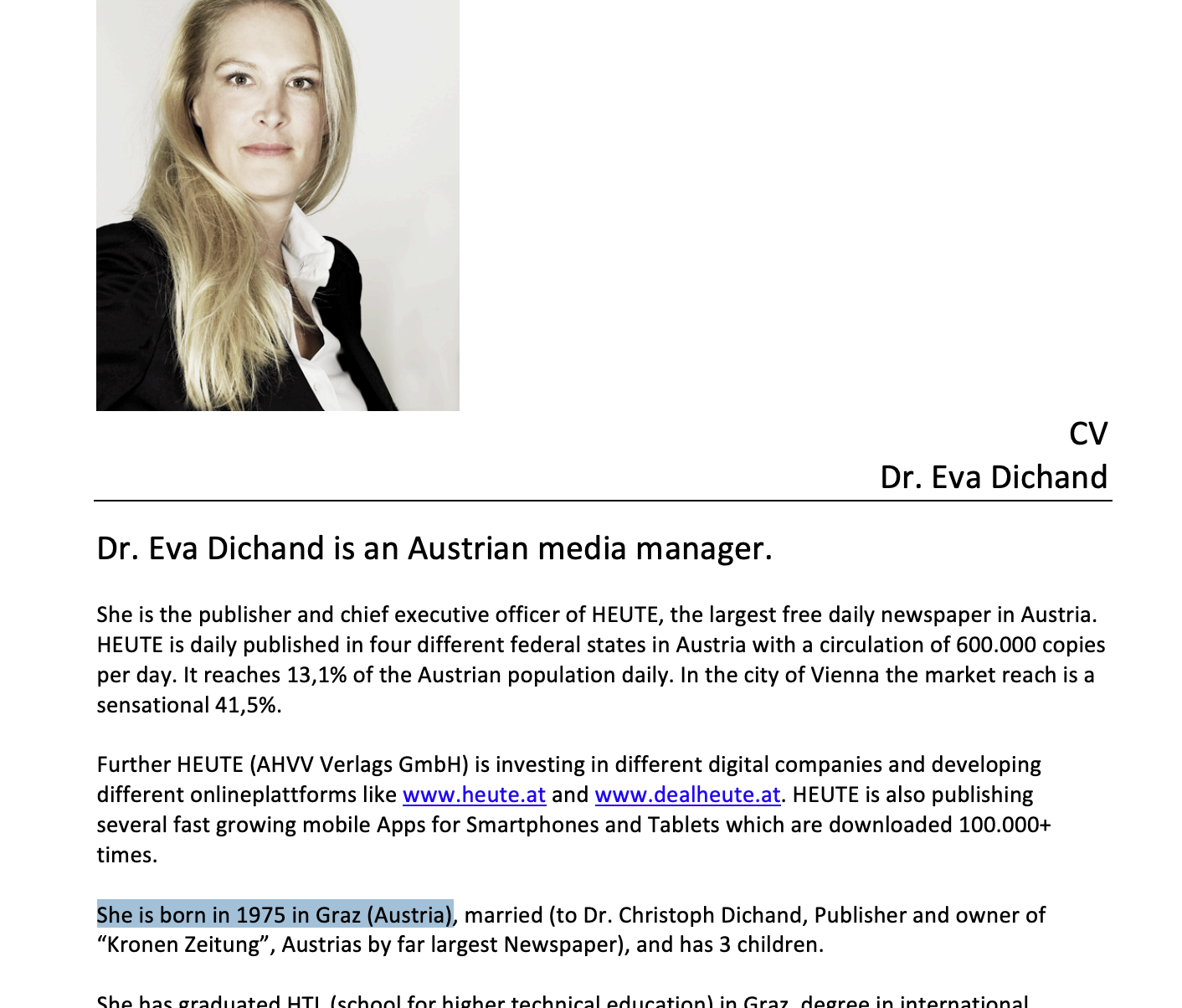 Im Mai 2012 stellte „Heute“ dann aber selbst einen falschen, verjüngten Lebenslauf von Eva Dichand als PDF auf Heute.at online. (Sollte die Datei zwischenzeitlich gelöscht werden, hier ein Screenshot). Kurz darauf vermerkte der oder die anonyme Autorin aus dem „Heute“-Verlag diese „offizielle“ Quelle. Und seither steht stand auf Wikipedia bei der „Heute“-Chefin ein falsches Geburtsjahr: