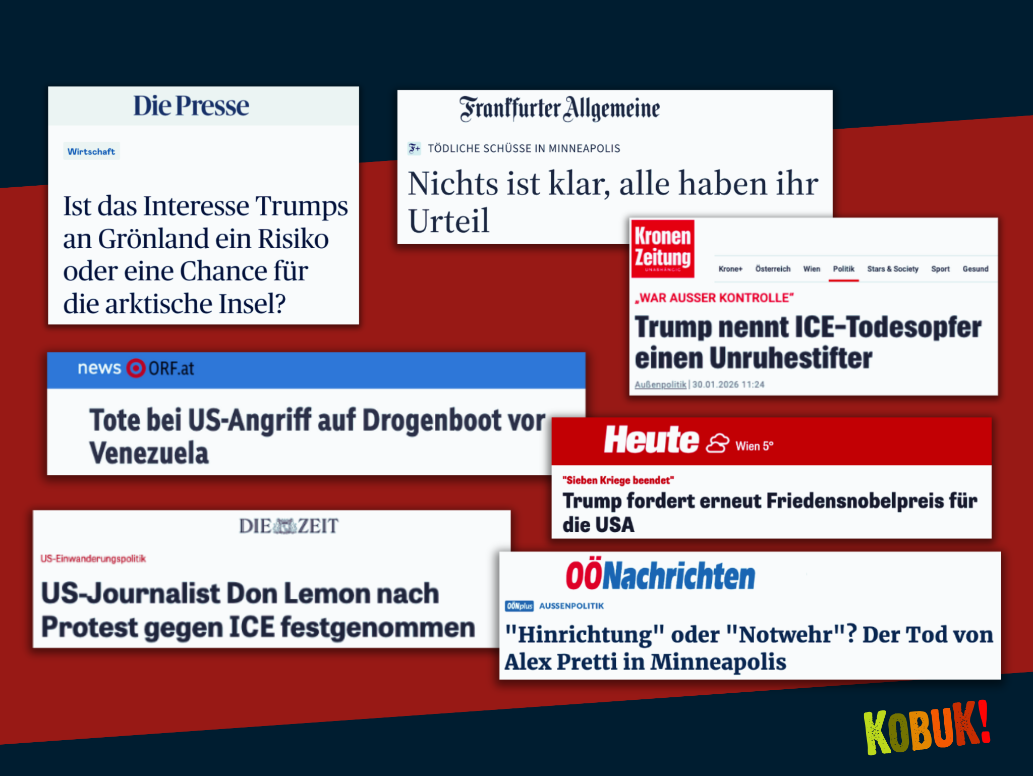 Trotz der eindeutigen Bilder gibt aber beispielsweise die Kronen Zeitung in ihrer Titelzeile die Version des US-Heimatschutzministeriums wieder: „Ministerium zu Todesschüssen: ‚Plante Massaker‘“. Auch Vol.at, News die Kleine Zeitung und die Salzburger Nachrichten machen das am nächsten Tag mit der APA-Headline „US-Grenzschutz zu Schüssen in Minneapolis: Beamte sind Opfer“. Auf Orf.at schreibt man zunächst nur vorsichtig: „Zweifel an Darstellung von US-Regierung“, ändert die Headline ein paar Stunden später aber in die deutlichere Variante „Video widerspricht Ministeriumsdarstellung“.