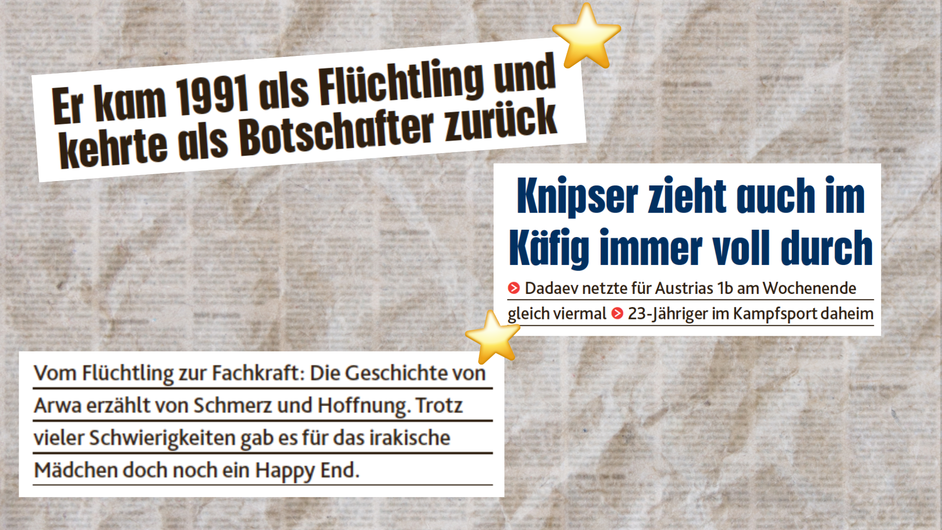 Noch deutlicher wird es beim Blick auf positive Berichterstattung. Unter rund 400 relevanten Artikeln in der Kronen Zeitung fanden sich gerade einmal zwei positive Beiträge explizit über Syrer, zwei über Tschetschenen und drei über Afghanen. Sie sind meist an Ausnahmesituationen gebunden und betreffen etwa spektakuläre Einzelfälle wie den syrischen Essenslieferanten, der nach seinem Eingreifen bei einem Messerangriff in Villach als „Held“ gefeiert wurde. Oder Fälle, in denen Geflüchtete selbst Opfer von Gewalt oder behördlichen Fehlern sind. Vereinzelt finden sich auch humanitäre Berichte, etwa ein Rettungseinsatz, bei dem zwei Afghanen nach einem Badeunfall das Leben gerettet wurde. Alltagsnahe Darstellungen jenseits solcher Fälle bleiben die Ausnahme. Der Rest erzählt fast ausschließlich von Gewalt, Bedrohung und Konflikt. Wer über diese Gruppen liest, liest fast immer Schlechtes.