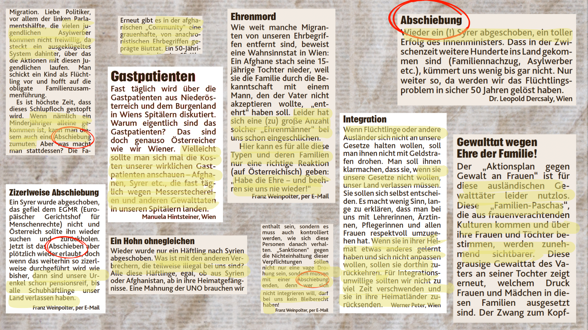 Noch deutlicher wird das Bild in den Leserbriefen. Dort finden sich regelmäßig pauschalisierende und teils offen rassistische Zuschriften. Afghanen oder Syrer werden als „Gastpatienten“ bezeichnet, Abschiebungen als Erfolg gefeiert. Wenn Menschen aus Syrien Österreich verlassen, ist das pauschal gut – wenn Menschen aus Syrien nach Österreich kommen, dann pauschal schlecht. Ganze Gruppen werden kollektiv verantwortlich gemacht, etwa indem Leserbriefe einen tragischen Mordfall zum Anlass nehmen, um eine ganze Gruppe von Afghanen als „Ehrenmörder“ abzustempeln. So verstärkt sich, was zuvor in Schlagzeilen angelegt wurde. Denn am Ende bleibt oft nur eine einziges dominantes Narrativ übrig. Es entsteht nicht durch einen oder mehrere besonders reißerische Artikel, sondern durch die Wiederholungen: Immer wieder dieselben Themen, dieselben Bilder, dieselben Zuschreibungen. Wer über Geflüchtete fast ausschließlich im Zusammenhang mit Gewalt, Kriminalität oder Sozialbetrug liest, lernt sie genauso kennen. Alles andere bleibt unsichtbar.