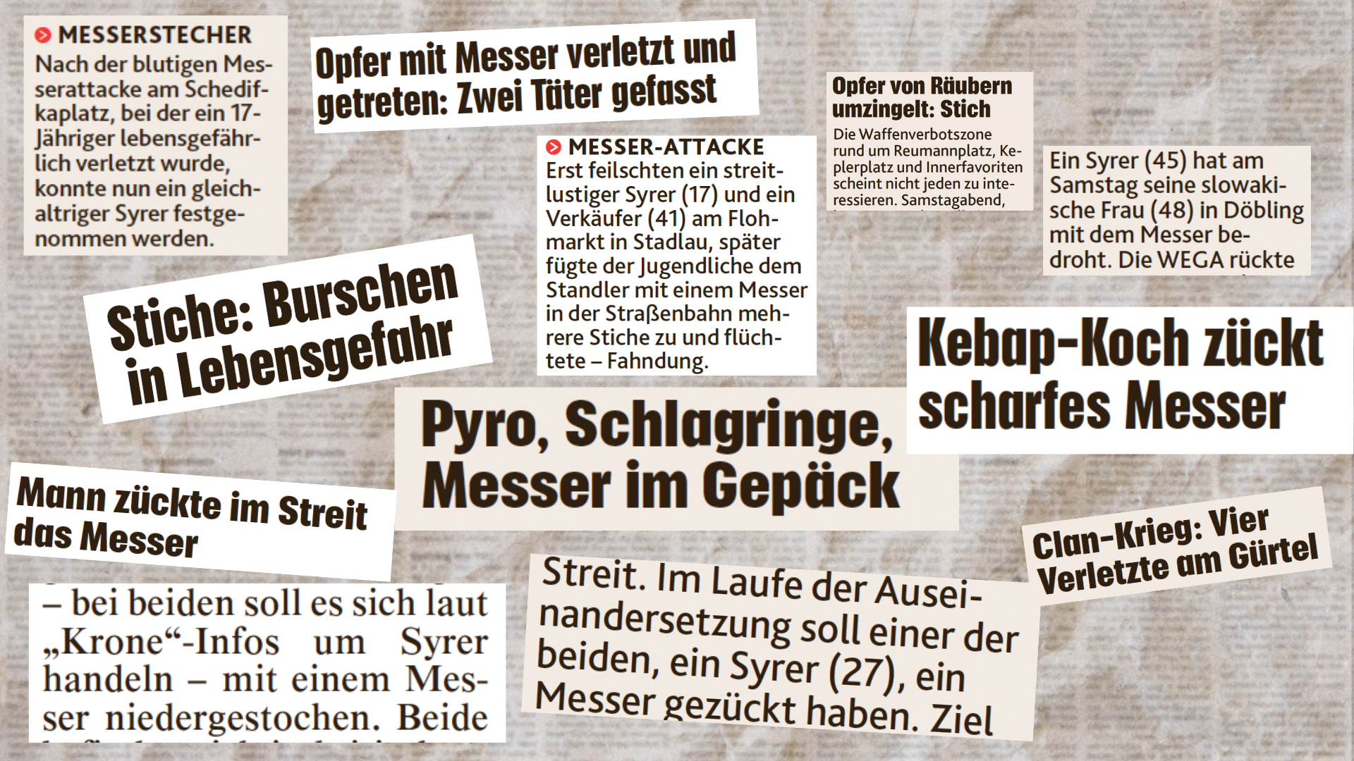 Während die Presse überwiegend analytisch berichtet, arbeitet die Kronen Zeitung deutlich zugespitzter. Ein Gegenstand dominiert die Berichterstattung über Geflüchtete hier wie kein anderer: das Messer. Küchenmesser, Machete oder Klappmesser – in vielen der Krone-Berichte über Geflüchtete aus Syrien oder Afghanistan, taucht es als Tatmittel oder Bedrohungssymbol auf. Wer diese Geschichten liest, bekommt leicht den Eindruck, diese Gruppen würden vor allem eines tun: auf andere einstechen.