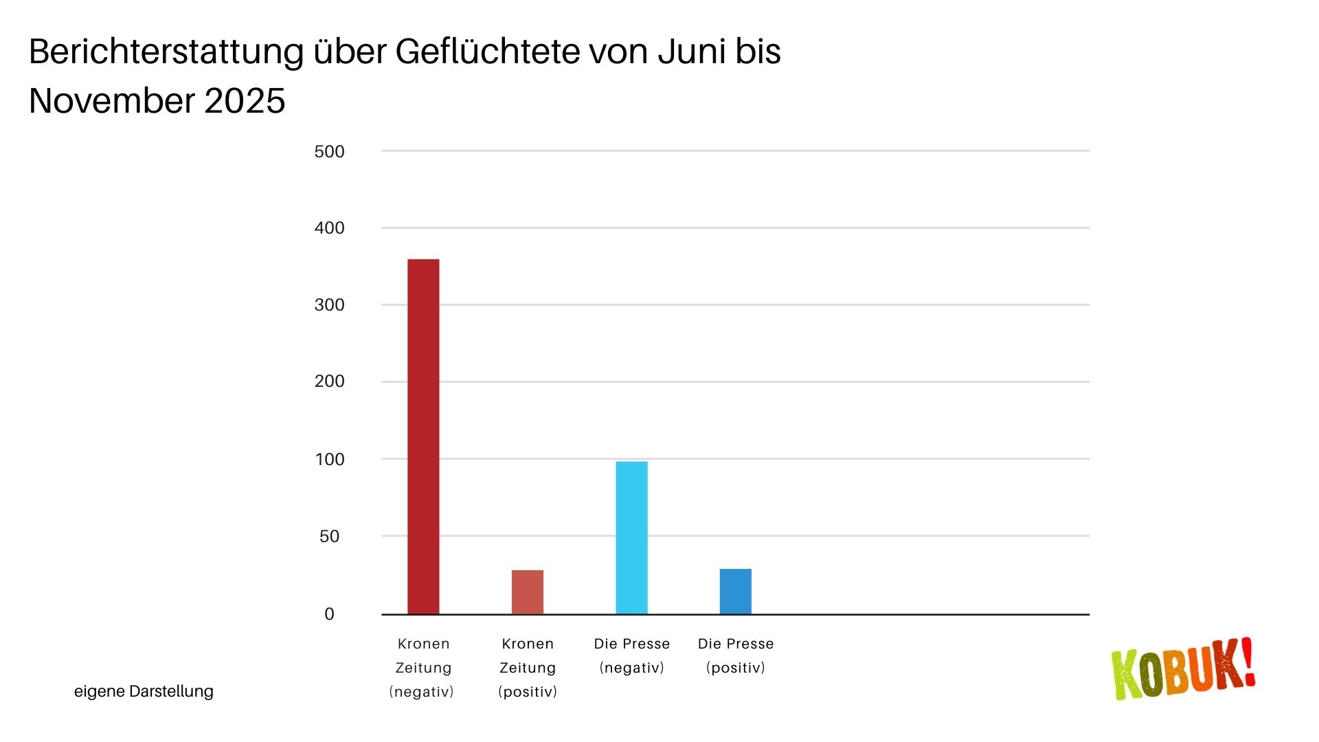 Um zu verstehen, wie solche Bilder entstehen, haben wir zwischen Juni und November 2025 insgesamt 547 Artikel ausgewertet – 132 in der Presse, 415 in der Kronen Zeitung. Welches Bild zeichnen österreichische Medien von Geflüchteten, insbesondere von Menschen aus Afghanistan, Syrien, der Ukraine oder Tschetschenien? Und wieso ist das relevant?