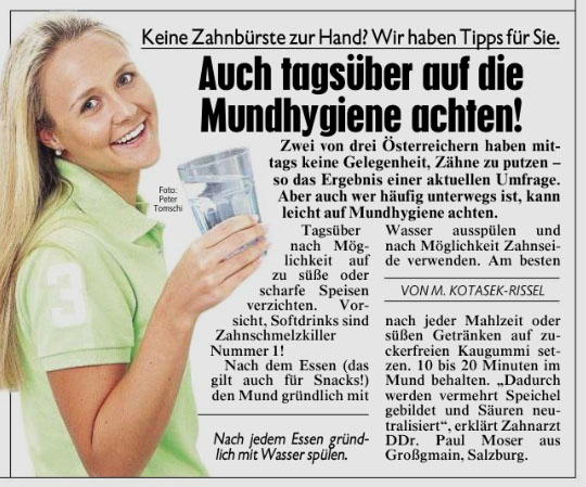 Nur rund jeder 3. Österreicher hat laut einer 2011 durchgeführten Market-Umfrage mittags Gelegenheit zum Zähneputzen. Fazit: Auch wenn man viel unterwegs ist, kann man zwischendurch einiges für Mundhygiene und Zahngesundheit tun.